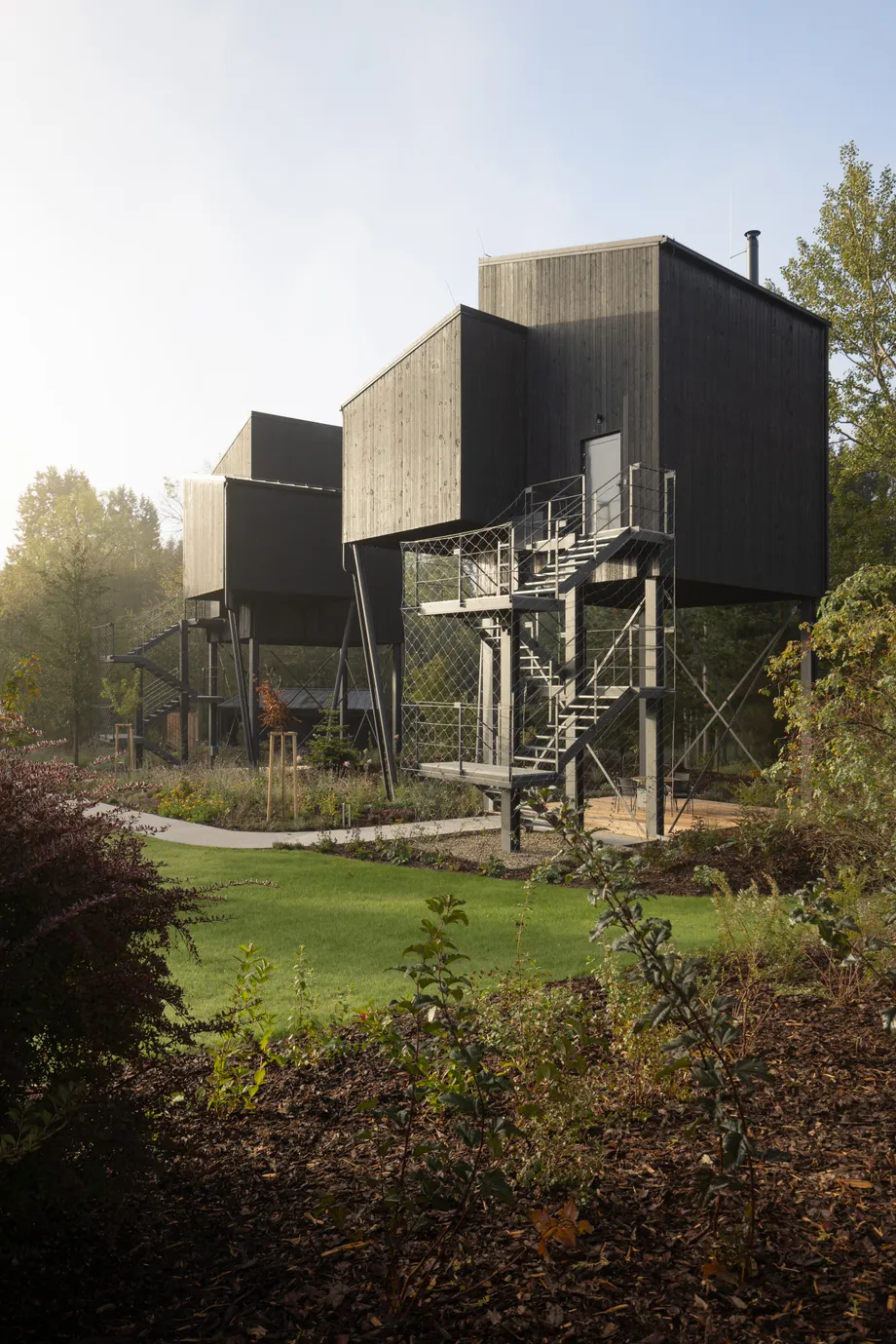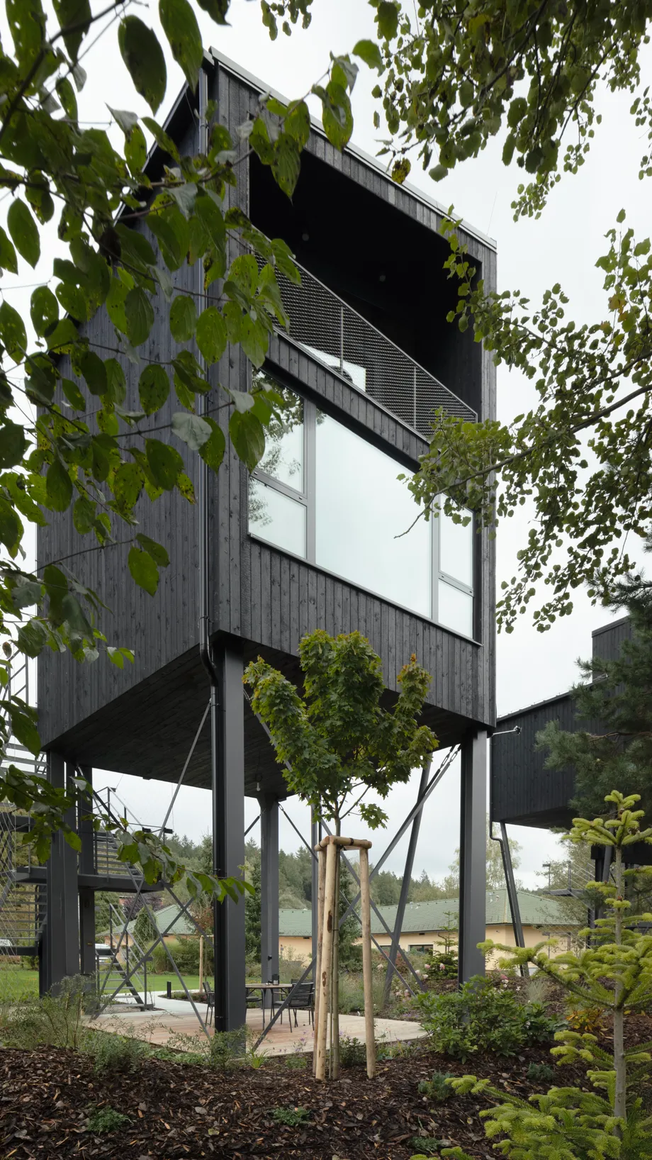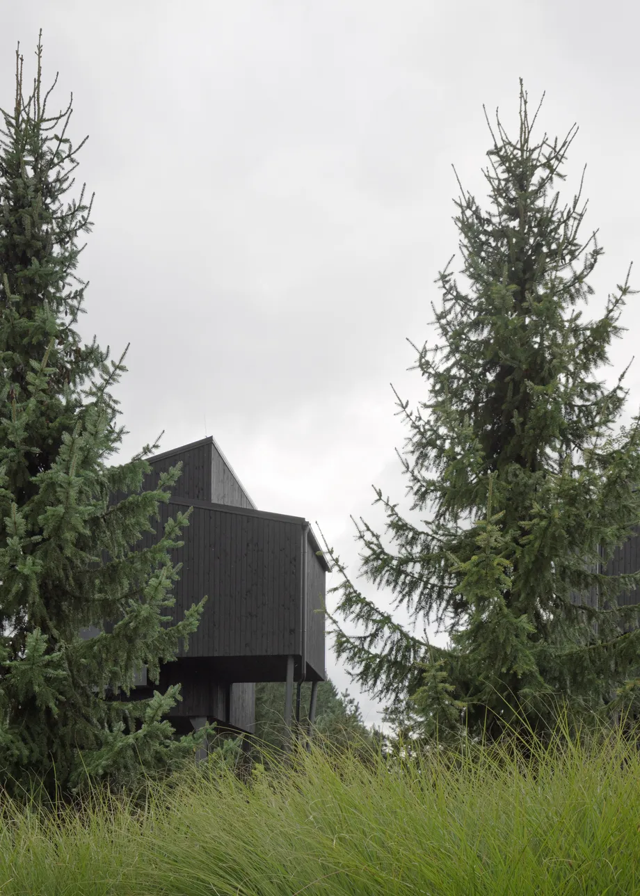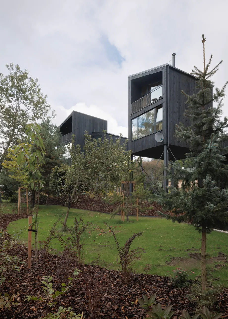 Na pomezí Vysočiny a Jihočeského kraje jsme navrhli zážitkové ubytování jako součást rozšíření hotelového resortu. Projekt zahrnuje dvě dvoupatrové dřevostavby umístěné v korunách stromů a wellness objekt zaměřený na relaxační procedury, který vytváří atmosféru klidu a regenerace.