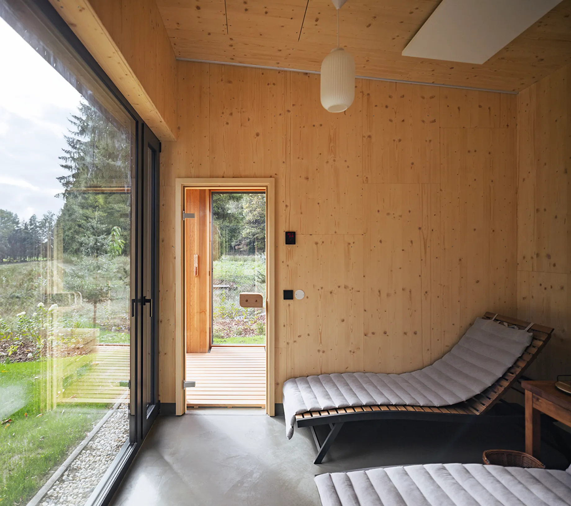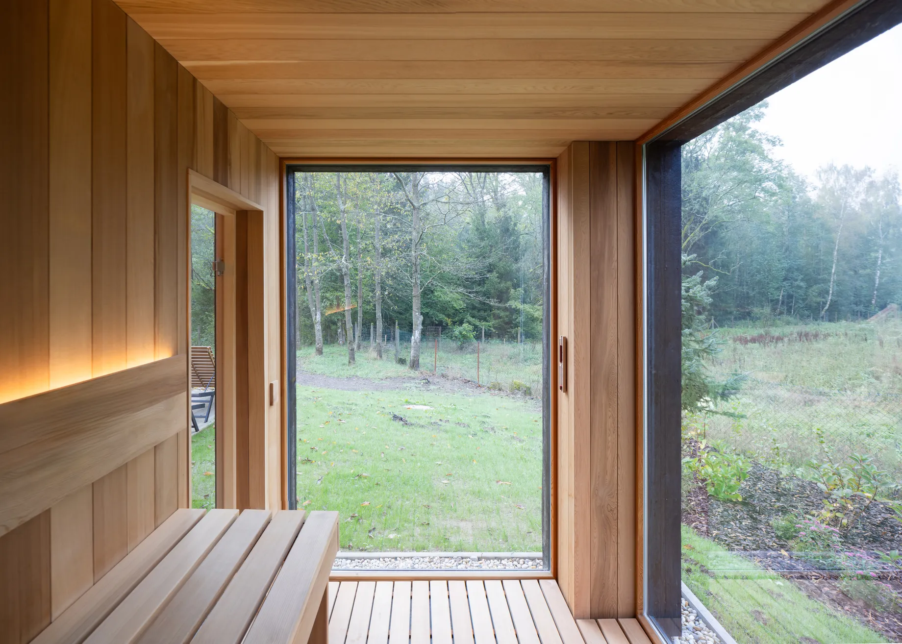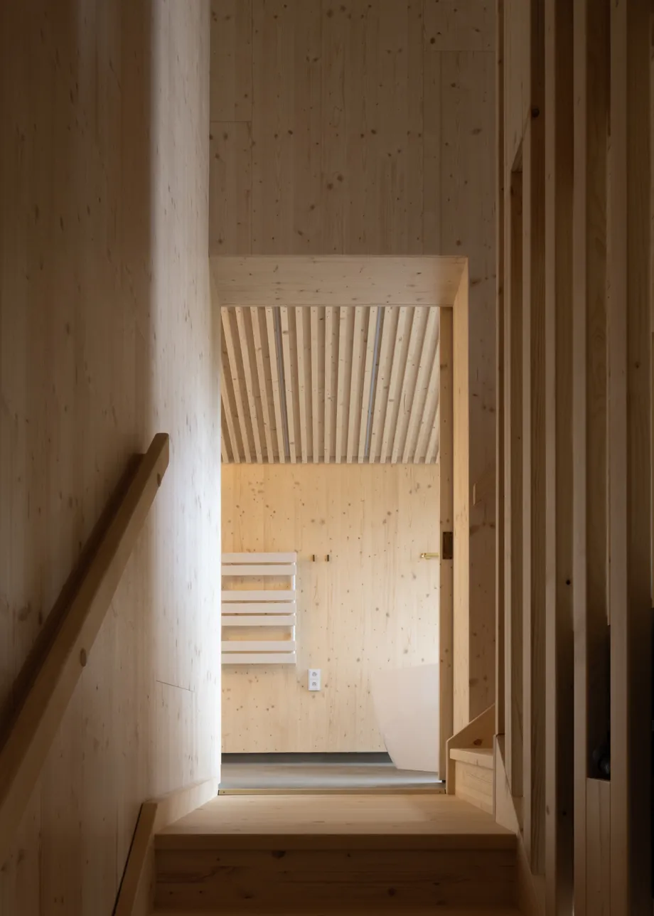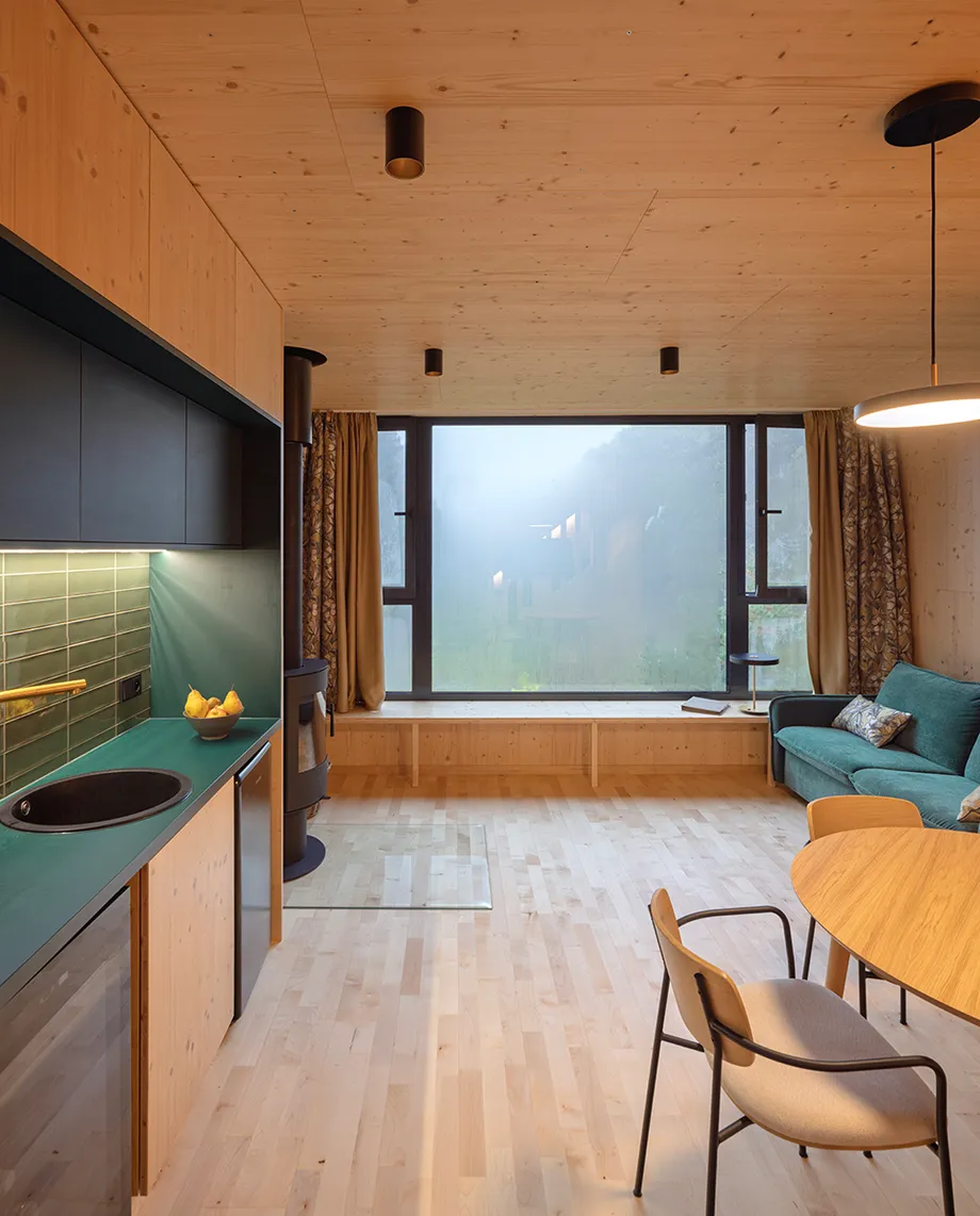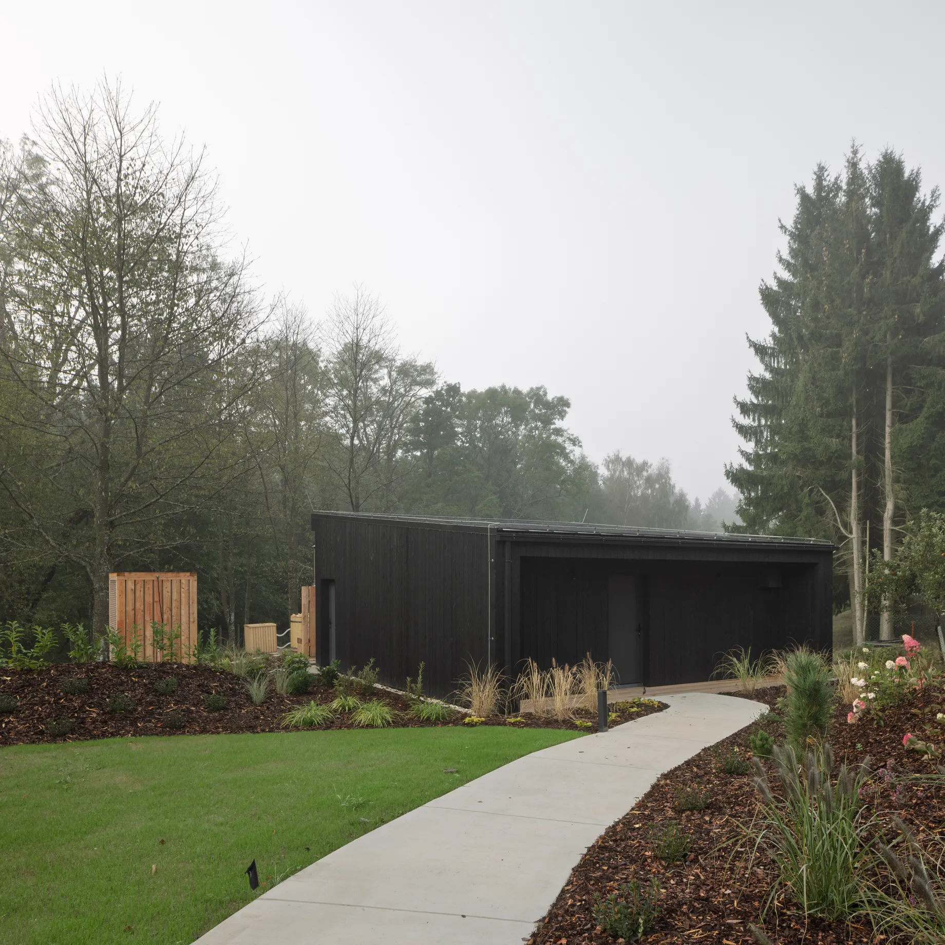 Vnitřní a vnější prostory jsou navrženy tak, aby vytvářely jednotný prostor, v němž se stírá rozdíl mezi exteriérem a interiérem. Fasáda z opalovaného dřeva, se kontextuálně zapojuje do krajinného rázu a zajišťuje dlouhodobou odolnost. Krajinné řešení parteru prohlubuje propojení s vegetací, čímž vytváří autentický zážitek v souladu s okolním prostředím.