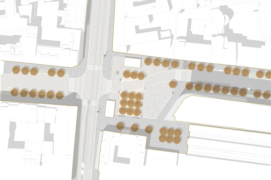 Nový veřejný prostor je navržen s důrazem na jednoduchou kompozici. Náměstí tak nabízí prostupnost území, multifunkční využití k pořádání různých společenských akcí, ale i klidný odpočinek pod vzrostlými stromy. Design nových vstupů do metra vychází z identity nového pražského mobiliáře a podporuje integritu místa.