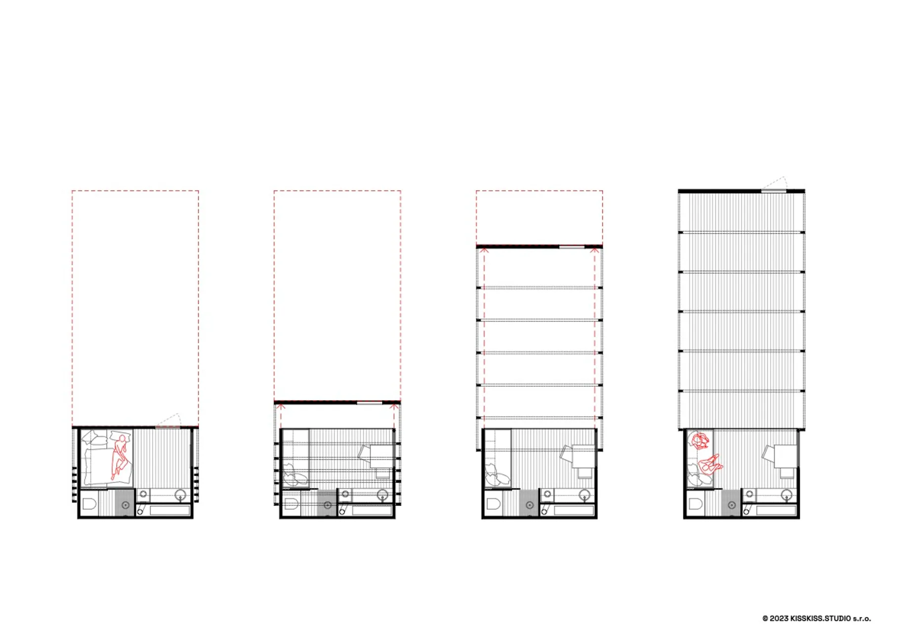 Tiny Tent jsme navrhli jako univerzální, rozšiřitelný prostor pro multifunkční využití. Základ tvoří malá dřevostavba, kterou lze díky systému rámů a membrán přizpůsobit aktuálním potřebám. Nabízí zázemí s plnohodnotnou kuchyní, sprchou, toaletou a teplou vodou. Je kompaktní, ale zároveň umožňuje velkorysé rozšíření, pokud to situace vyžaduje.