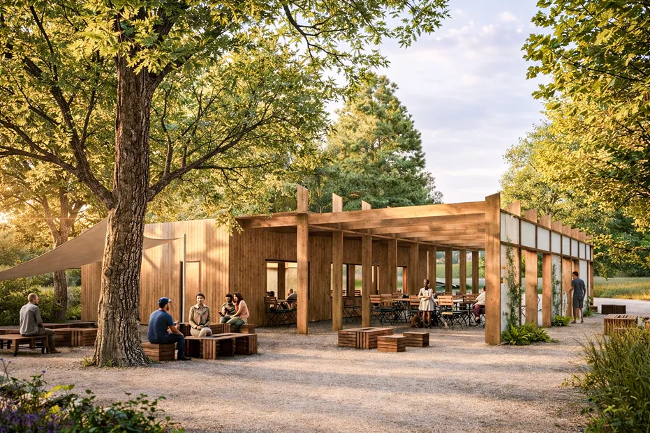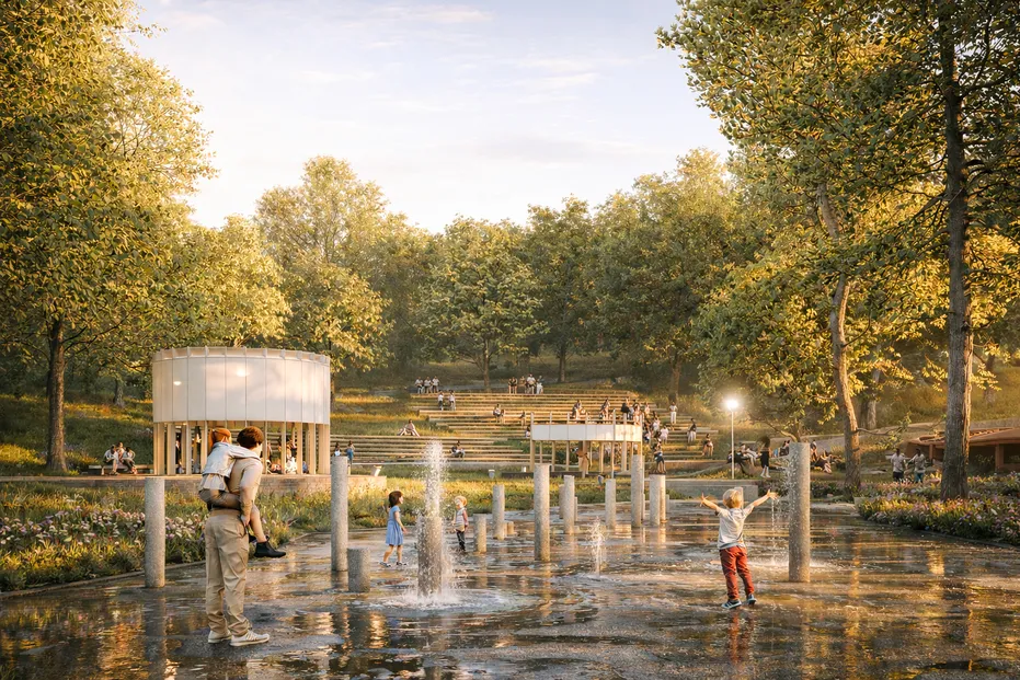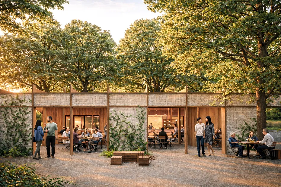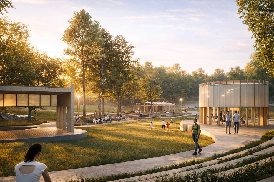 Soubor drobných staveb nabídne návštěvníkům komplexní zážitek, který zahrnuje amfiteátr pro společenské a kulturní akce, nové bistro pro gastronomii a vzdělávací pavilon. Kromě toho prostor zahrnuje dětská hřiště, umělecké instalace a relaxační zóny. Krajinné řešení celé oblasti podporuje a posiluje tento koncept.